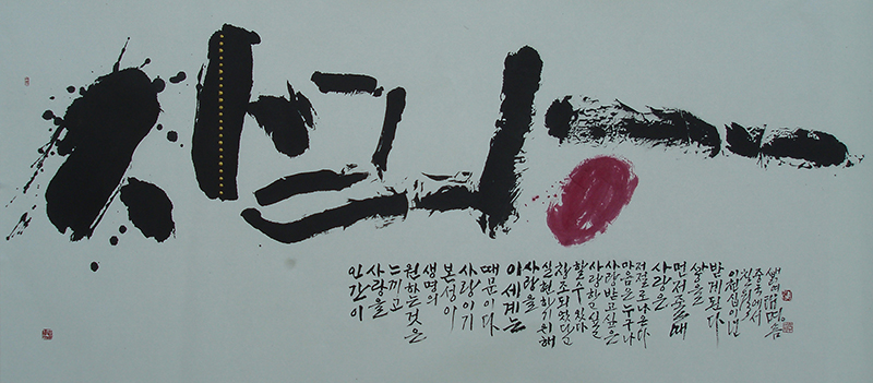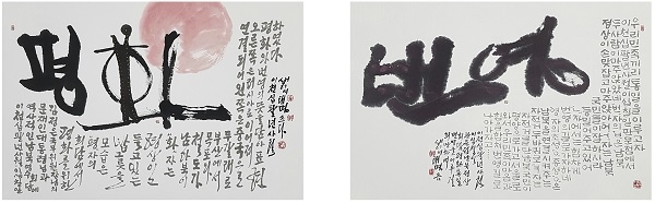 그의 화면은 종종 한글·한자·알파벳·다양한 언어의 단어들이 겹겹이 중첩된 문자 풍경처럼 보인다. 2019년 「평화와 번영」 전시에서는 ‘평화’라는 단어를 한글뿐 아니라 폴란드어, 체코어, 아랍어, 헝가리어 등 여러 언어로 써 하나의 화면에 담아내기도 했다. 이는 특정 민족이나 계층에 한정되지 않는, 인류 보편의 가치로서의 평화와 소통을 문자 예술로 시각화하려는 시도로 읽힌